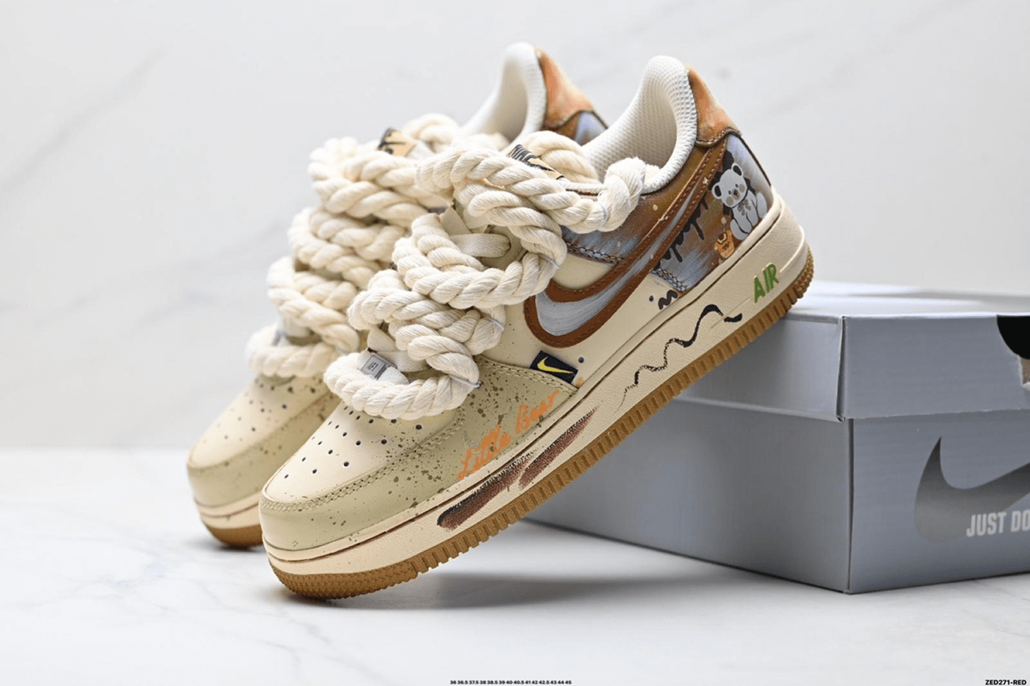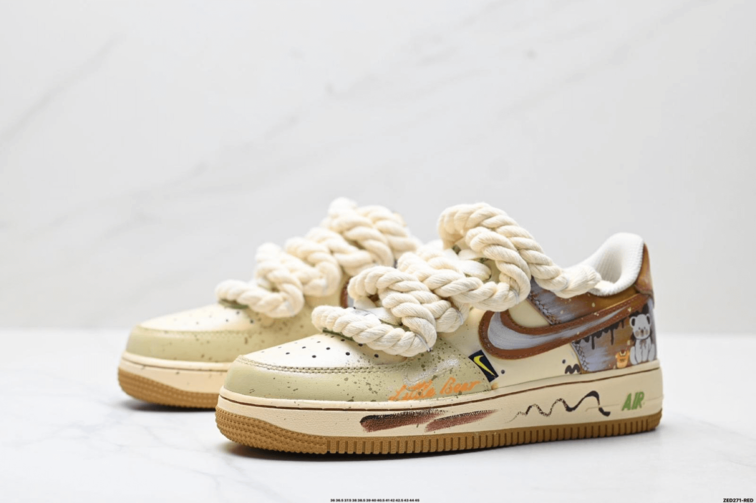 Nike Air Force 1 Custom “Little Bear” Egy cukorfalat custom darab: krémszínű bőr vintage festéssel, imádnivaló kézzel festett koala macikkal, csepegő méz-motívummal és “Little Bear” felirattal, plusz vastag, bézs rope lace-szel a fűzőben.